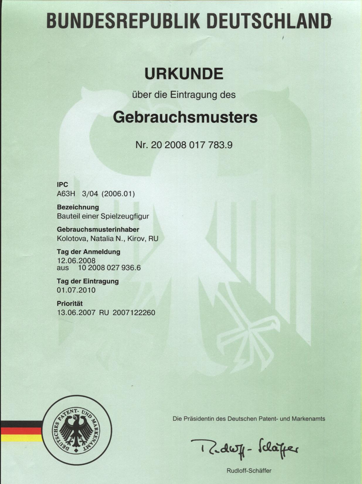 URKUNDE über die Eintragung des Gebrauchsmusters Nr. 20 2008 017 783.9 (DE)