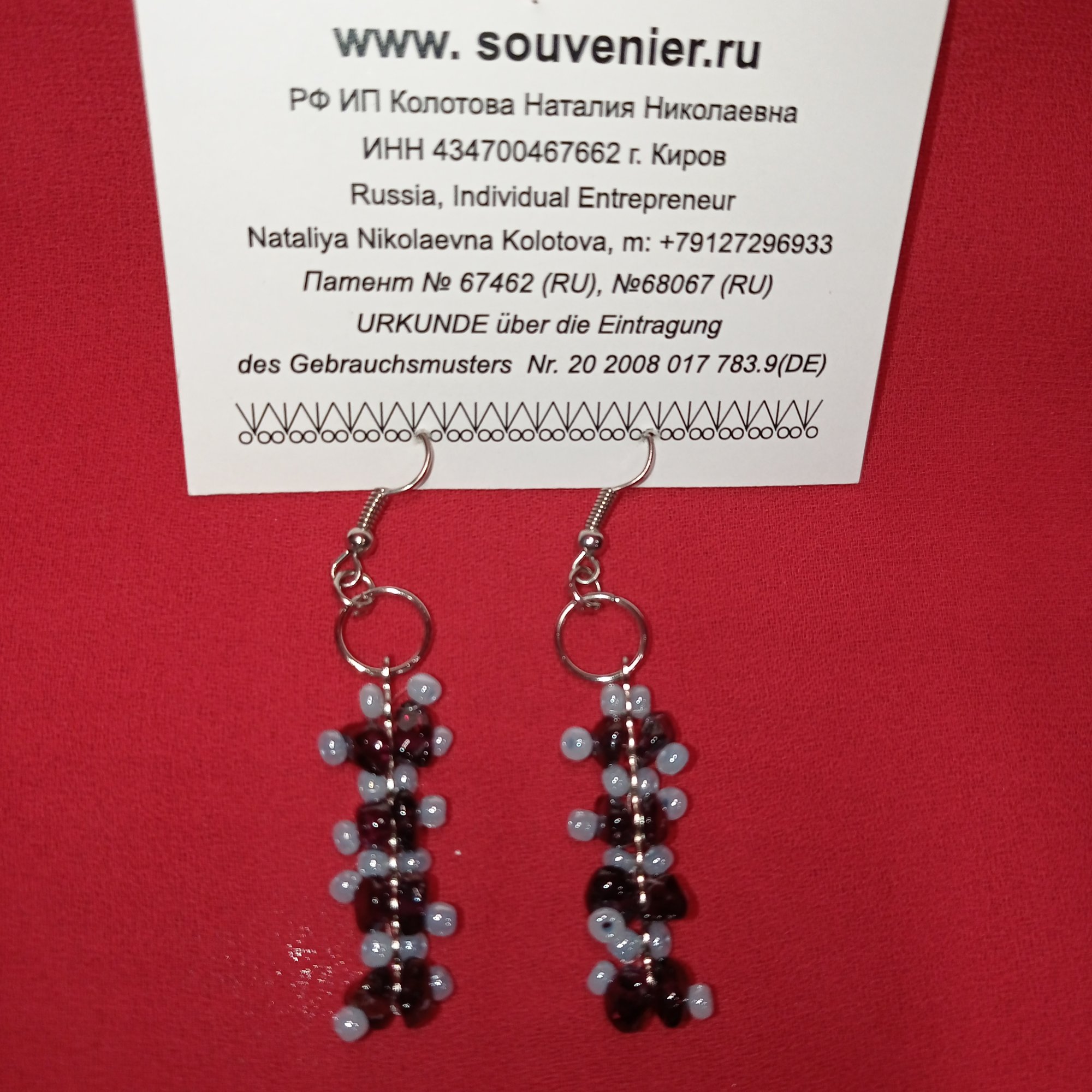 Дизайнерские украшения из натуральных камней: серьги (швензы) «Металлическая пластина с гранатом». Вес: 20 г, длина – 60 мм. Материал: гранат, бисер, металл. Цвет: бордовый, голубой.