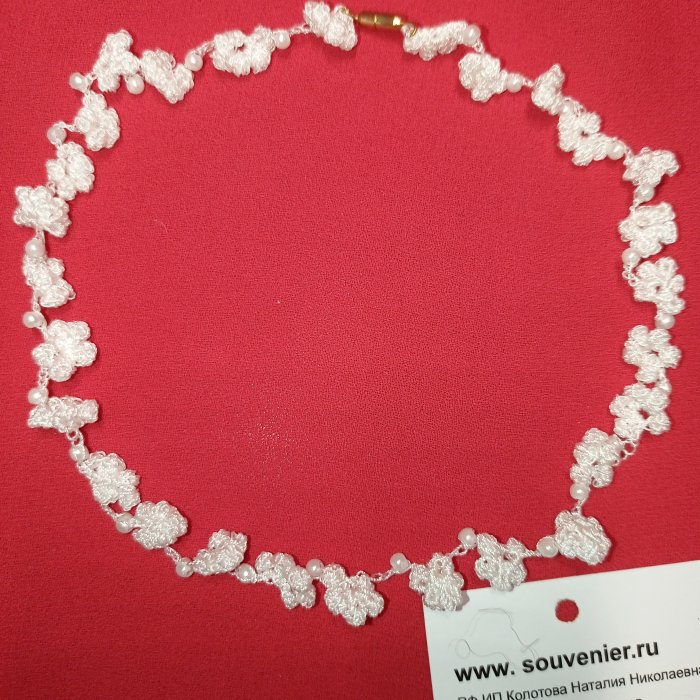 Свадебные аксессуары для невесты: колье «Нежность» в подарочной упаковке. Вес: 30 г, длина – 340 мм.. Материал/ Инструмент: шёлковые нити, искусственный жемчуг / крючок. Ручная работа с использованием техники вязания крючком. Цвет: белый.