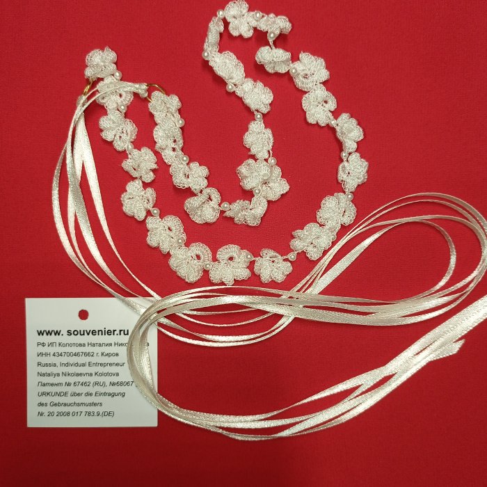Свадебные аксессуары для невесты: колье «Яблоневый цвет» в подарочной упаковке. Вес: 80 г, длина – 1,5 м. Материал/ Инструмент: шёлковые нити, "Жемчуг Swarovski elements"/ крючок. Ручная работа с использованием техники вязания крючком. Цвет: белый.