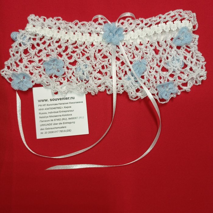 Свадебные аксессуары для невесты: подвязка «Незабудки» в подарочной упаковке. Вес: 60 г, длина – 70 мм. Материал/ Инструмент: хлопчатобумажные нити, жемчуг искусственный/ крючок. Ручная работа с использованием техники вязания крючком. Цвет: белый.