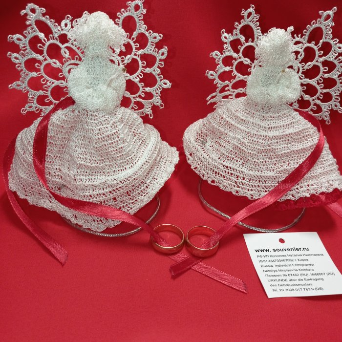 Свадебные аксессуары для новобрачных: сувениры «Ангелы «Любви» - 2 шт. Вес - 1 шт.: 100 г, высота сувенира = 130 мм. Материал/ Инструмент: шёлковые нити, медная проволока/ крючок. Ручная работа с использованием техники вязания крючком и фриволите.