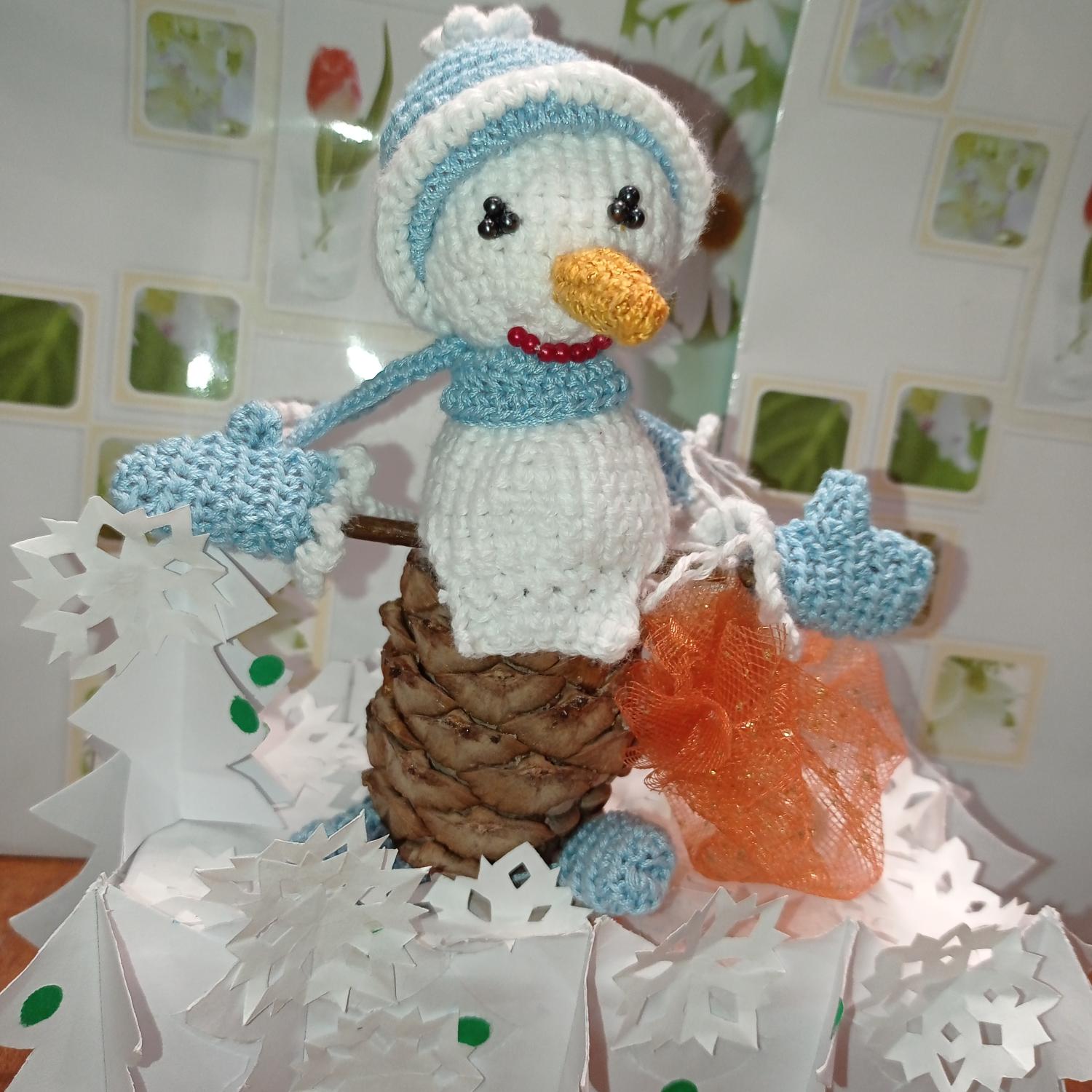 Вес сувенира: 150 г, высота - 180 мм. Материал/ Инструмент: кедровая шишка, ветка клёна, картон, бумага листовая для офисной техники "SvetoCopy" формат А4, цветная бумага, бисер, искусственный жемчуг, капроновая цветная сетка, синтепон, нити «Ирис» - 100 % хлопок (цвет: белый, голубой, оранжевый), клей - карандаш "ErichKrause", медная проволока / крючок № 1 - 1,5, игла, ножницы, карандаш, дырокол для бумаги. Технологическая карта по изготовлению сувениров с использованием техники вязания крючком по запатентованной технологии.